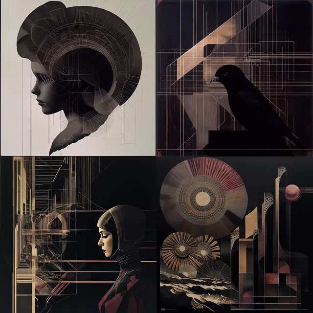 Этот стиль отличается поразительным сочетанием геометрической абстракции и линейной точности. Его отличает элегантность минимализма и структурированные композиции. Однотонная палитра подчёркивает угловатые формы и геометрические мотивы, создавая изысканный визуальный язык, напоминающий эстетику Баухауса и Де Стейла.