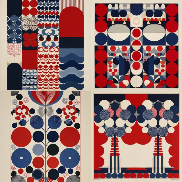 Доминирует смелая геометрическая абстракция с ритмичными узорами и яркой красно-сине-белой палитрой. Стиль отличается созданием визуальной гармонии за счёт симметричного повторения и чёткой геометрии. Заметно влияние Баухауса и Де Стейла, придающее современный оттенок.
