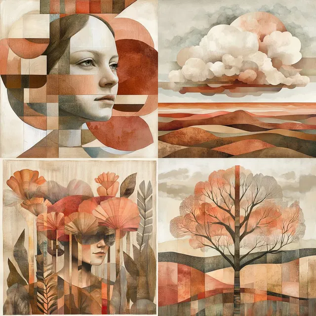 Стиль «Geometric Earth Tones» отличается сочетанием геометрической абстракции с тёплой, земляной палитрой цветов. Для этого стиля характерны текстурированные наложения и сложные узоры, напоминающие влияние кубизма и Баухауса.