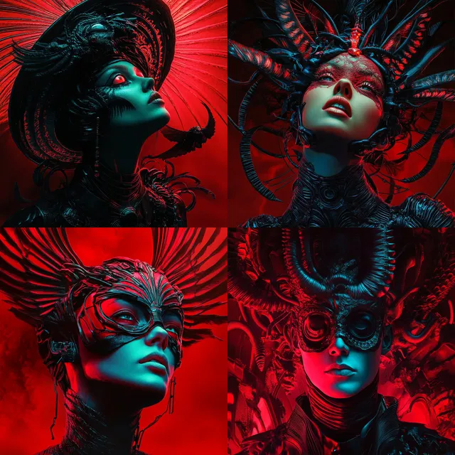 Этот стиль поражает ярким сочетанием красного и чёрного цветов. Он вызывает ощущение жуткого футуризма и сюрреалистичной элегантности. Замысловатые биоморфные формы создают завораживающую эстетику, напоминающую работы Х. Р. Гигера, с особым акцентом на светотеневой игре и драматическом освещении. Композиции отличаются детальной проработкой, сложными текстурами и динамичными ракурсами, которые придают изображению ощущение движения и глубины.