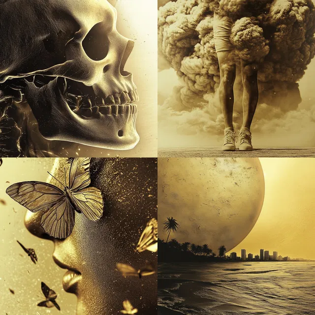 Этот стиль отличает поразительное сочетание золотистых оттенков и фактурных поверхностей, которое вызывает ощущение вневременной элегантности и сложных деталей. Использование тонов сепии и металлического блеска создаёт тёплую, ностальгическую атмосферу, напоминающую об искусстве ар-нуво и сюрреализме.