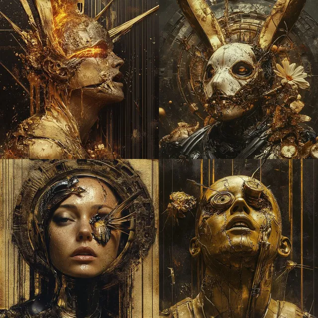 Стиль «Позолоченное кибер-барокко» отличается сложными деталями и металлическими текстурами, создающими блестящую, богато украшенную эстетику, напоминающую влияние барокко. В композициях преобладают сложные конструкции и геометрические узоры, симметричные рисунки и тщательно продуманные макеты.