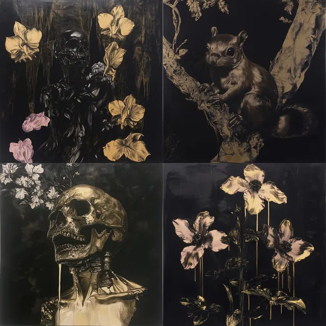 «Gilded Noir» очаровывает драматическим взаимодействием света и тени, напоминая о влиянии барокко и рококо. Стиль отличается созданием контрастных визуальных образов с золотыми акцентами на тёмном фоне, что придаёт ощущение богатства и тайны. Замысловатые текстуры и детальные узоры усиливают его декоративность, а темы варьируются от неземной моды до футуристических городских пейзажей.