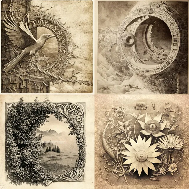 В этом стиле преобладает детальная прорисовка и палитра сепии, что вызывает ощущение ностальгии и исторической глубины. Для работ характерны сложные техники травления и гравировки, создающие комплексный и витиеватый визуальный нарратив. Применение геометрических и симметричных узоров придаёт структурность и архитектурность, напоминая о влиянии викторианского и готического стилей.