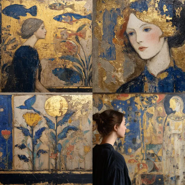 Золотые текстуры и витиеватые узоры главенствуют, создавая мистическую и чарующую атмосферу, напоминающую о влиянии византийского искусства и ар-нуво. Насыщенные цветовые гаммы золота и синего усиливают ощущение чего-то неземного, а детальная проработка и многослойные композиции добавляют глубины и сложности.