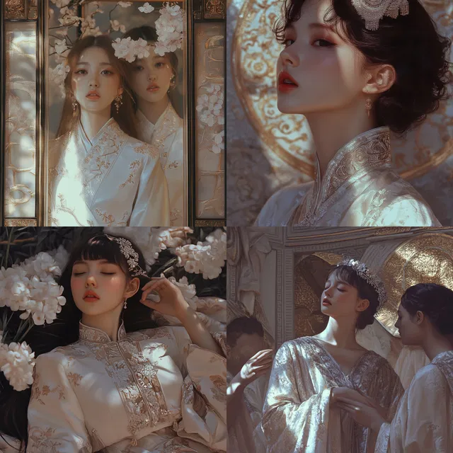 Мягкое освещение и нежные тени создают безмятежную и сказочную атмосферу, а витиеватые узоры и роскошные текстуры вызывают ощущение неподвластной времени изысканности.