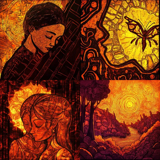 Этот стиль — яркое исследование эстетики витражного искусства. Он завораживает своей детальной проработкой и изысканным орнаментом, напоминающим модерн и византийское влияние. Тёплые золотистые оттенки и сияющее свечение создают чарующую атмосферу, а текстуры, похожие на мозаику, добавляют глубины и сложности.