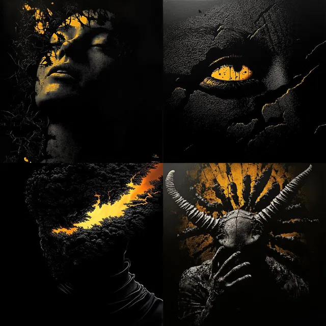 Золотой нуар: сюрреализм завораживает драматичным использованием светотени, создавая поразительное взаимодействие света и тени. Этот стиль отличается глубиной текстуры и детальной проработкой, часто используя монохромную палитру с яркими золотистыми акцентами.