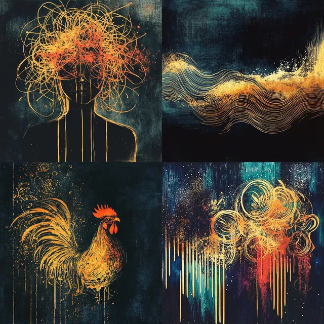 Этот стиль отличает поразительное сочетание золота и чёрного. Он характеризуется текстурированными слоями и динамичными композициями. Использование металлических бликов и сложной прорисовки напоминает об искусстве модерна и символизме, создавая мистическую атмосферу.