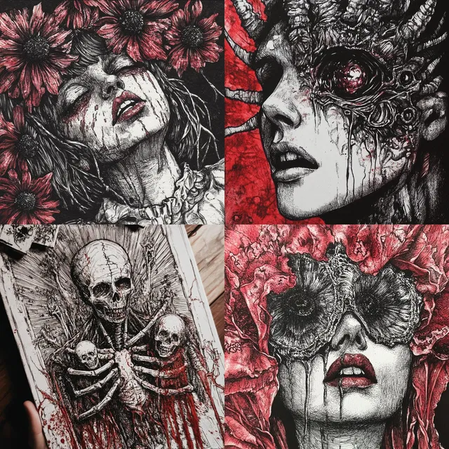 Готическое изящество завораживает своей замысловатой линейной работой и контрастным использованием света и тени, создавая призрачное, но увлекательное визуальное повествование. Использование в этом стиле монохромных палитр с яркими красными акцентами создаёт жуткую атмосферу, а сложные композиции и выразительные текстуры вызывают ощущение мрачной романтики.