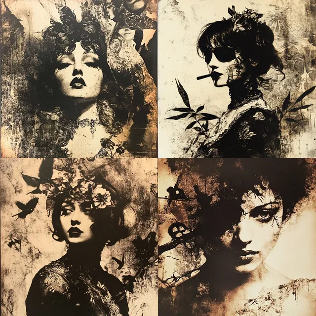 Отчётливый визуальный стиль, который отличается текстурированными поверхностями и многослойными композициями. Он вызывает ощущение мрачной романтики и сюрреалистического экспрессионизма. Использование тонов сепии и высокого контраста создаёт винтажную эстетику, напоминающую о влиянии готики и викторианской эпохи.