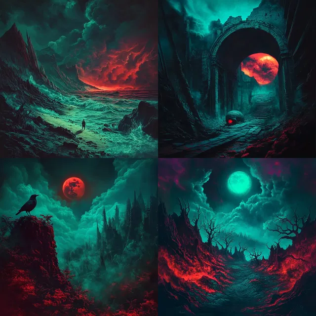 Доминируют ярко-бирюзовый и насыщенно-малиновый цвета, которые создают сюрреалистичное атмосферное напряжение. Стиль определяют драматическое освещение и замысловатые текстуры, которые вызывают призрачную мистическую ауру, напоминающую влияние готики и барокко. Композиции насыщены сюрреалистичными элементами, предлагая уникальное сочетание фэнтези и антиутопических тем.