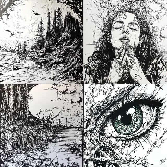 Монохромная сложность очаровывает своей детальной прорисовкой и замысловатыми элементами, создавая визуальную историю, в которой переплетаются фантазия и реальность. В этом стиле используются высококонтрастные чёрно-белые изображения, чтобы вызвать драматическое и атмосферное настроение, усилить эмоциональную глубину и потенциал каждого произведения в плане повествования.