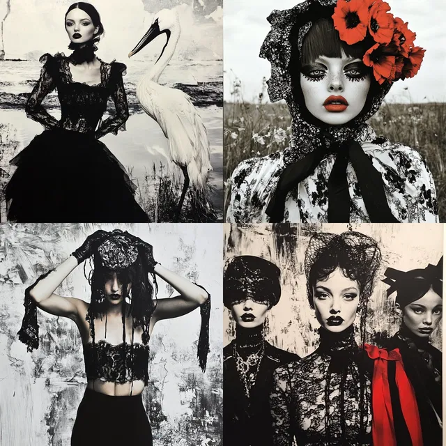 В этом стиле преобладает монохромная элегантность, которая отличается драматичностью и театральностью. Использование чёрно-белых тонов создаёт яркий контраст, подчёркивая сложные детали и текстуры в различных темах. Готические и мрачные элементы придают композициям таинственность и загадочность.