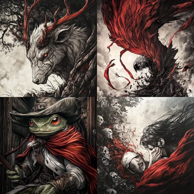Этот стиль завораживает своими выразительными текстурами и замысловатыми деталями, драматичными контрастами и тёмной элегантностью. В основе лежит монохромная палитра с яркими алыми акцентами. Стиль вызывает призрачную атмосферу, сочетая готический сюрреализм с фэнтези-иллюстрацией.