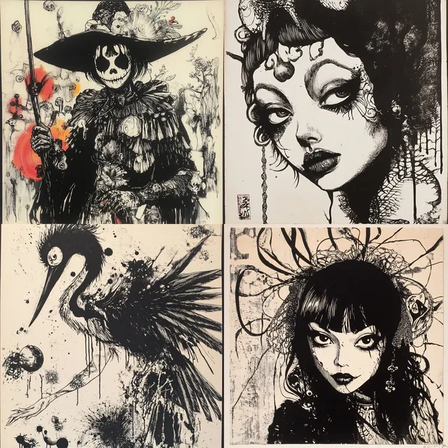 Этот стиль отличается жирными линиями и высокой контрастностью, в нём сочетаются сюрреалистические и готические элементы с нотками поп-арта. Монохромная палитра подчёркивает эффект от драматичных чернильных брызг и подтёков, создавая динамичную композицию.