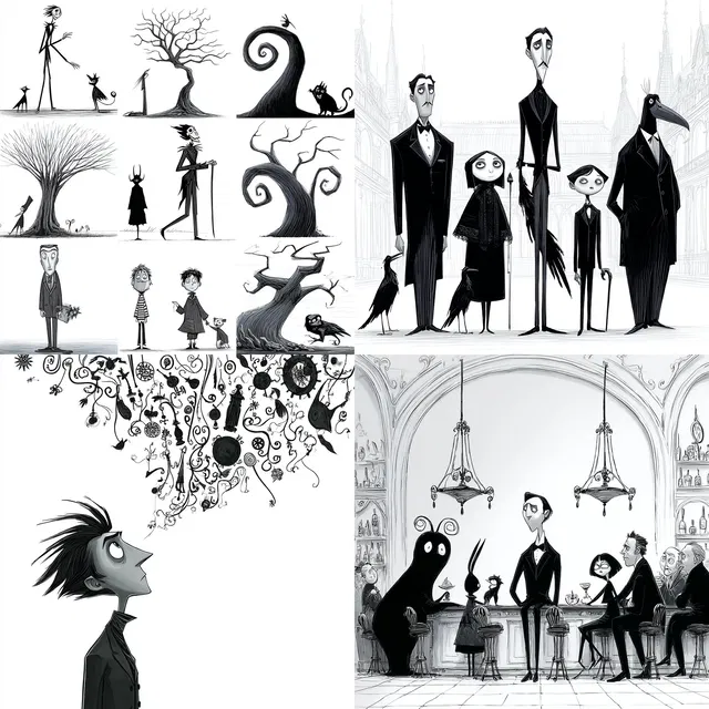Этот стиль отлично подходит для изображения необычных персонажей и сюрреалистичных пейзажей, напоминающих кинематографическую вселенную Тима Бертона. Он особенно хорош в создании иллюстраций для редакционной работы и дизайна персонажей, хотя может не дотягивать до фотореализма или ярких цветовых схем.