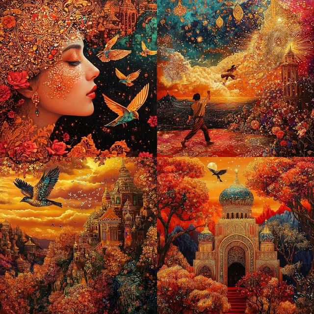 Каждый элемент — это торжество декоративного дизайна с драгоценными украшениями и пышными текстурами, которые вызывают ощущение величия под влиянием византийского стиля и рококо. Тёплая, яркая палитра с преобладанием золотых и янтарных тонов создаёт ощущение тепла и роскоши, а причудливые и фантастические темы переносят зрителей в сказочную реальность.