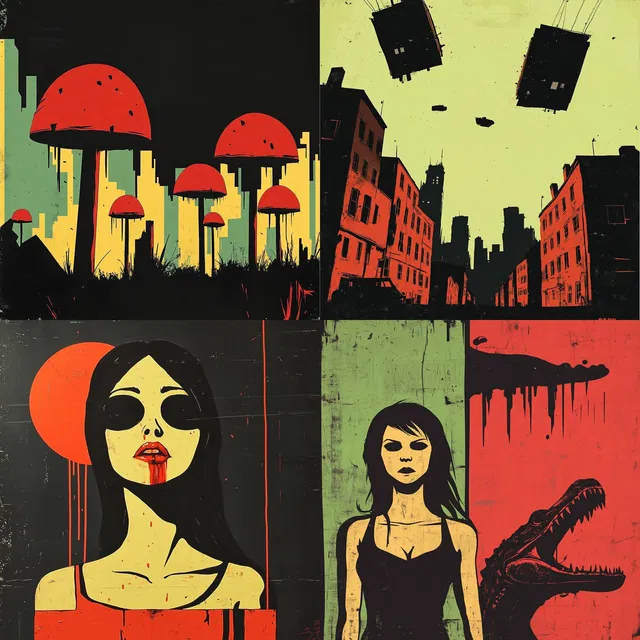 Стиль идеально подходит для редакционных иллюстраций и графических романов. Его сила заключается в способности передавать мощные истории с помощью резких, упрощённых визуальных образов.