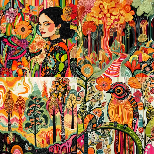 Этот стиль пестрит яркими цветами и замысловатыми узорами. Он объединяет элегантность модерна с психоделическим буйством. Изысканность линий и детальные композиции создают динамичное визуальное повествование, одновременно причудливое и чарующее.
