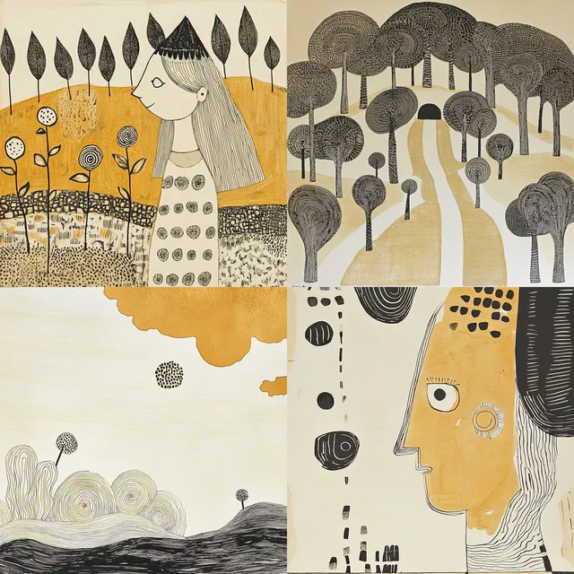 Этот стиль отличается минималистичными линиями и ручной эстетикой рисования. В нём чувствуется дух народного искусства с влиянием модернизма. Композиции структурированы, но в то же время причудливы, часто содержат повторяющиеся узоры и геометрические формы. Использование монохромной палитры и природных тонов подчёркивает простоту и невинность образов, создавая игривую и детскую атмосферу.