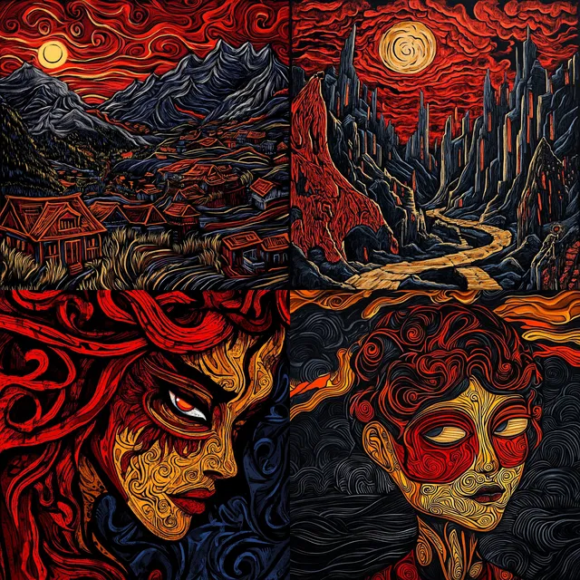 Драматическое освещение и высокий контраст наполняют каждое произведение динамичной энергией, напоминая движения экспрессионистов и символистов. Этот стиль прекрасно передаёт сильные настроения и мощные сюжеты, что делает его идеальным для редакционной иллюстрации, графических романов и концепт-арта.