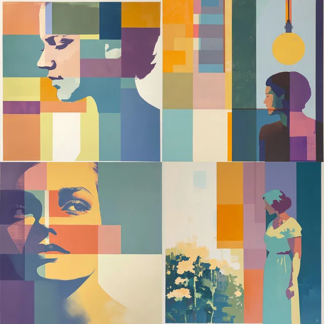 Преобладает яркая геометрическая абстракция с многослойными цветовыми блоками и структурированными формами. В этом стиле используются приглушённые пастельные и гармоничные тона, что создаёт спокойное, но динамичное визуальное впечатление. Фрагментарные фигуры и абстрактные пейзажи напоминают модернистское, кубистическое влияние, сочетая простоту со сложностью.