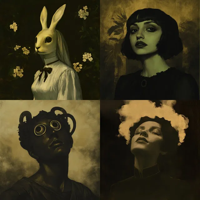 Этот стиль отличается ярким взаимодействием светотени и приглушённых тонов, что создаёт навязчивую и загадочную атмосферу в различных темах. Использование игры света и тени придаёт глубину и драматичность, а текстурная насыщенность и плавные градиенты усиливают сюрреалистичность и символичность образов.