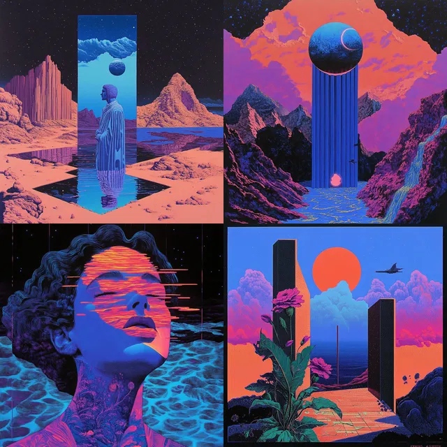 Этот стиль, яркий и сюрреалистичный, словно из сна, очаровывает смелыми цветовыми контрастами и космическими темами. Он отлично подходит для создания потусторонних пейзажей и персонажей, сочетая элементы ретрофутуризма с мистическими сюжетами.