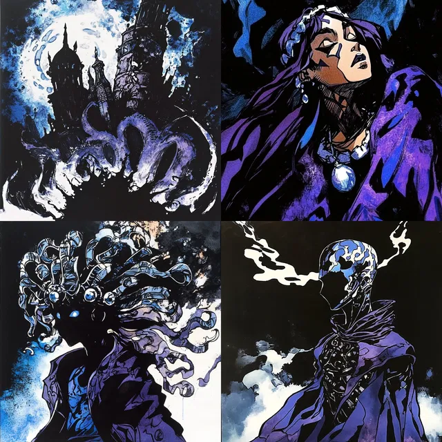 В центре внимания — мистические фигуры и футуристические городские пейзажи, которые вызывают ощущение мрачной фантазии и неоготических влияний. Этот стиль, несмотря на свой иллюстративный и вдохновлённый комиксами подход, может не обладать фотореализмом в более реалистичных контекстах.