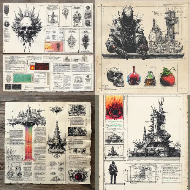 Использование монохромной и приглушённой индустриальной палитры усиливает ощущение чего-то грубого и механического, а сложные детали и многослойность добавляют глубину и интерес.