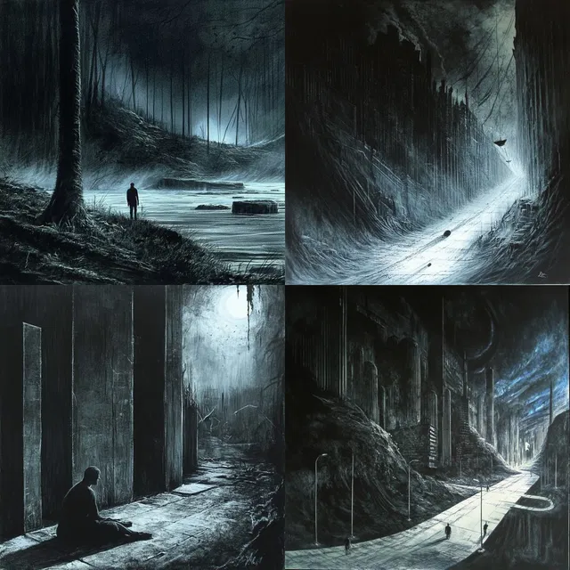 Стиль отлично подходит для создания атмосферности и изображения одиноких фигур, но может испытывать трудности с фотореализмом и яркими цветами. Идеален для проектов, требующих мрачной, вызывающей эмоциональный отклик эстетики, но менее подходит для живых или красочных тем.