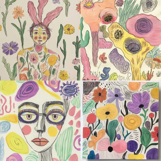 Этот стиль яркий и причудливый. Его отличает игривая, по-детски непосредственная иллюстрация в духе наивного искусства. Пастельные цвета создают мягкую и радостную атмосферу, а линии и узоры произвольной формы вызывают ощущение спонтанности и веселья.