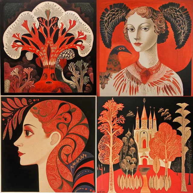 Стиль во многом основан на искусстве ар-нуво и народных традициях, включает в себя мотивы Восточной Европы и отголоски византийского стиля. Основное внимание уделяется элементам природы, архитектурным сооружениям и фигурам людей, что создаёт богатую картину культурного наследия и мифологических сюжетов.