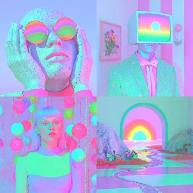 Доминируют яркие пастельные тона и переливающиеся текстуры, создавая сюрреалистичную и сказочную атмосферу. Причудливые элементы и игривые композиции вызывают чувство удивления и потусторонности. Стиль отличается созданием живых, выразительных образов с уникальным влиянием современного поп-арта. Однако его опора на яркие цвета и сюрреалистические темы может ограничивать универсальность в более сдержанных или реалистичных контекстах. Идеален для авангардной моды, брендинга и художественных инсталляций, он завораживает своим смелым, творческим подходом.