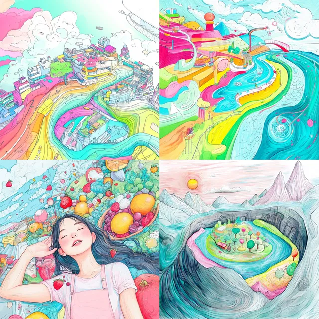 Этот стиль яркий и причудливый, он очаровывает своим игривым использованием цвета и динамичными композициями. Пастельные оттенки и мягкие градиенты создают сказочную атмосферу, а плавные линии и органические формы усиливают его сюрреалистичность.