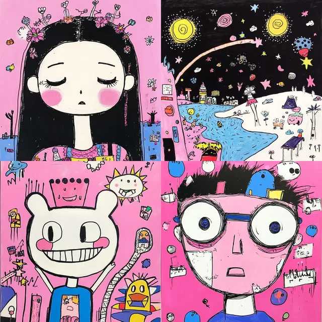 Этот яркий и причудливый стиль отличается детской наивностью, смелыми контурами и игривыми мотивами. Персонажи и пейзажи изображаются с помощью простых форм и ярких плоских цветов, что вызывает чувство радости и пробуждает воображение. Стиль вдохновлён поп-артом и создаёт современный образ, доступный и привлекательный. Он отлично подходит для передачи невинности и фантазии, но из-за отсутствия глубины и реализма может быть ограничен в применении в более серьёзных или детальных контекстах.