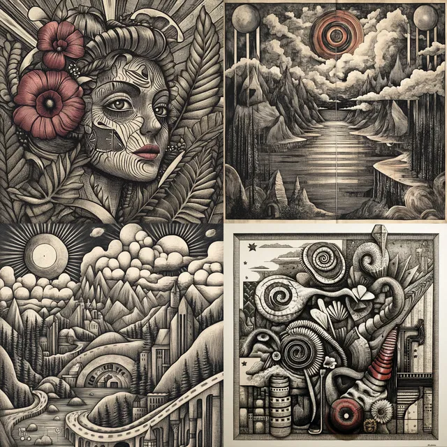 В этом стиле преобладают сложные линии и текстурная глубина, которые создают богатую палитру визуальной сложности. По всему полотну вплетены символические элементы и декоративные мотивы, которые придают каждому произведению повествовательность.