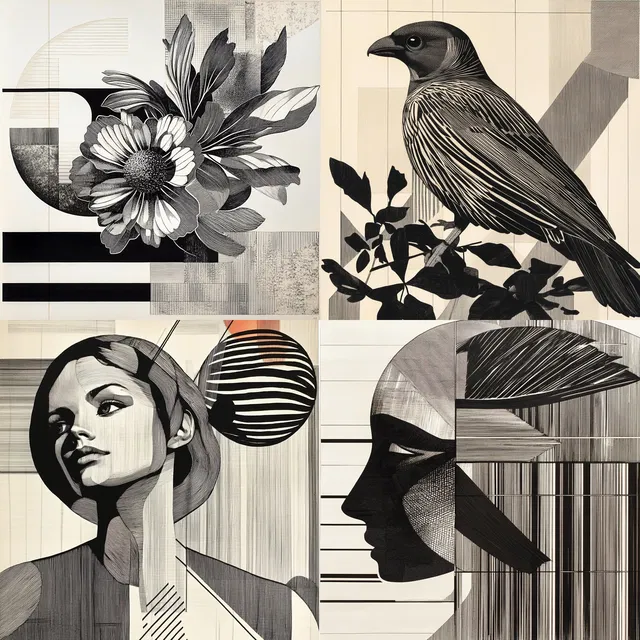 Этот стиль отличается сложной линейной прорисовкой и монохромной палитрой. Он прекрасно подходит для создания графических композиций с выраженной текстурой. Точность линий и глубина текстуры проявляются в различных темах — от футуристической архитектуры до иллюстративного оформления статей.