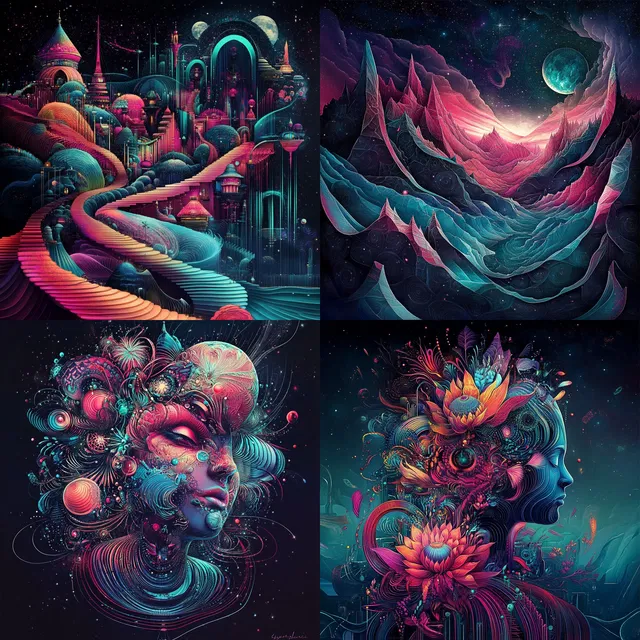 Этот стиль отличается яркими неоновыми оттенками и замысловатыми деталями. В нём абстрактные и сюрреалистичные элементы сочетаются с футуристическим видением. Композиции сложны, с плавными, криволинейными формами, которые вызывают ощущение потусторонней красоты.