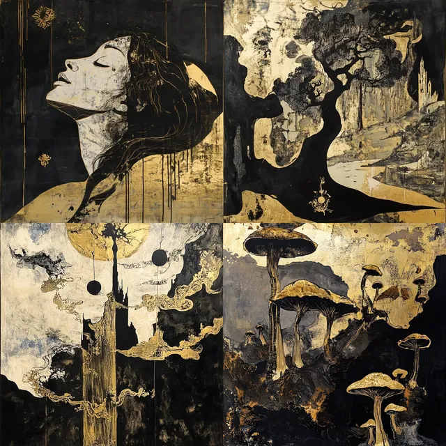 Этот стиль сочетает в себе элегантность модерна и мистику символизма. Богато украшенные и детализированные элементы создают изысканный образ. Золотые акценты мерцают на тёмном, фактурном фоне, создавая эффект светотени, который усиливает воздушность и мифические качества. Плавные линии и сложные узоры вызывают ощущение величия и потусторонности, напоминая работы Климта и Мухи.