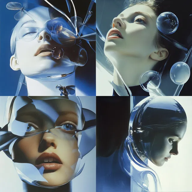 В этих образцах преобладают отражающие текстуры и полупрозрачные слои, создающие сюрреалистичную, сказочную атмосферу. Стиль прекрасно подходит для воплощения футуристических и эфемерных тем. Для передачи ощущения отражённого спокойствия используются холодные оттенки синего и серебристый металлик.