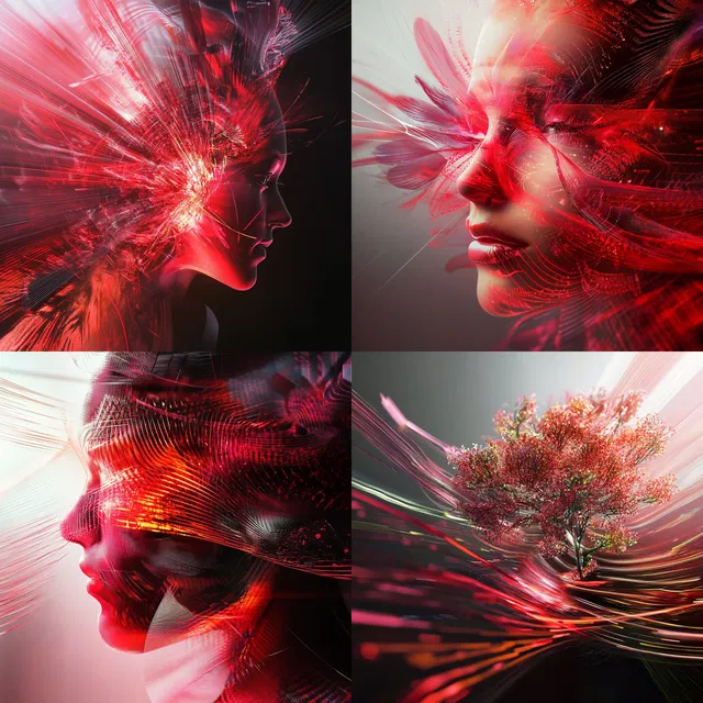 Эфирная подсветка и световые эффекты определяют этот стиль, создавая сюрреалистичную и сказочную атмосферу в различных темах. Преобладающий красный цвет придаёт визуальному повествованию динамичность и плавность форм, часто с элементами футуризма и абстракции.