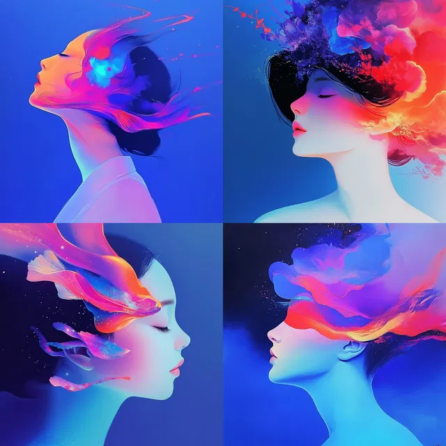 Этот стиль определяют яркие неоновые оттенки и плавные формы, которые создают сказочную и эфемерную атмосферу. Использование насыщенных цветов и текучих форм рождает ощущение сюрреализма, а тонкие многослойные переходы добавляют глубины и сложности.