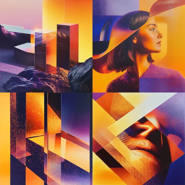 В этом стиле преобладает светящаяся геометрическая абстракция, для которой характерны яркие цветовые палитры и динамичное освещение. Угловатые конструкции и отражающие поверхности создают сюрреалистическое сочетание, часто включающее абстрактные формы и архитектурные мотивы.