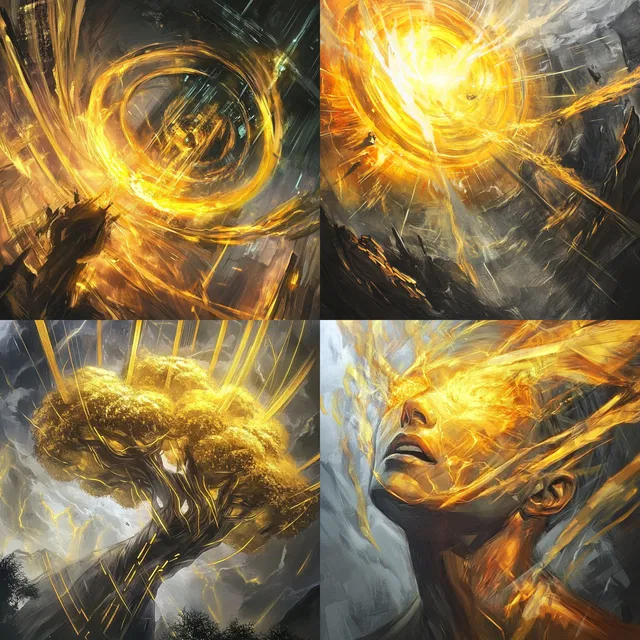 В этом стиле доминируют золотые оттенки и сияющая энергия, создающие светлую и воздушную атмосферу в различных темах. Энергичные композиции и динамичное движение неизменно подчёркиваются яркой манерой письма и сложной детализацией.