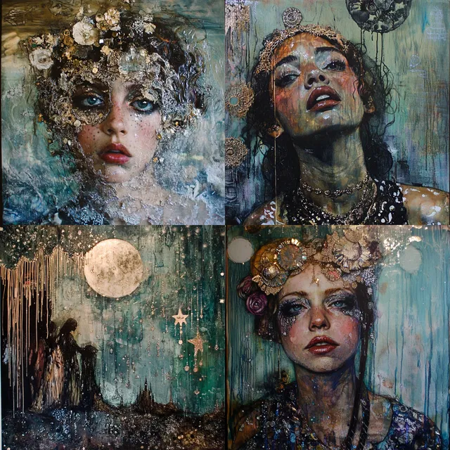 Этот стиль воздушный и сказочный. Его отличают богатые текстуры и пышные украшения. Замысловатые детали и витиеватые узоры создают мистическую и чарующую атмосферу, напоминающую модерн и символизм. Преобладающие цвета — бирюзовый, сине-зелёный и металлик — придают изображению мерцающее, переливающееся качество.