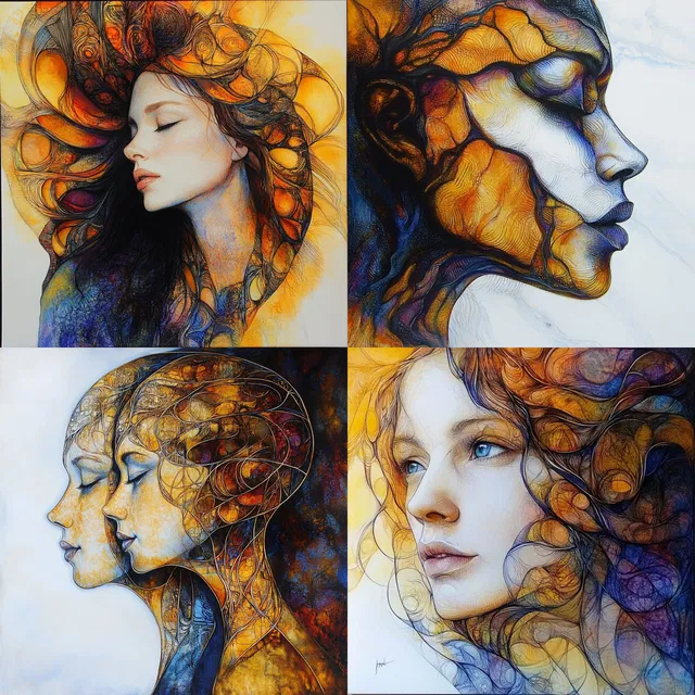 Сложные узоры и органические формы преобладают, создавая неповторимое полотно под влиянием стилей модерн и символизм. Стиль отличается неземным сиянием и гармоничным балансом, которые погружают в атмосферу мечты. Тёплые тона и насыщенный синий цвет усиливают его мистическое очарование. Детальная текстура и многослойные поверхности добавляют глубины, а плавные линии и естественные формы вызывают ощущение движения и жизни.