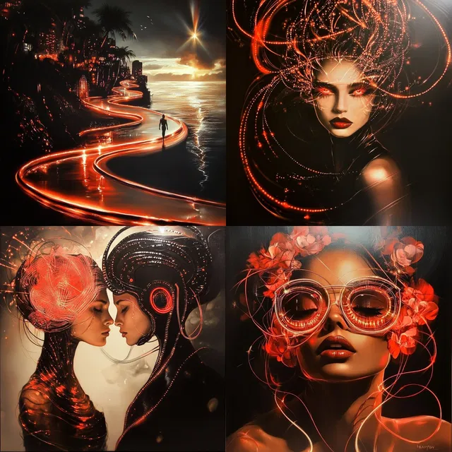 В этом стиле преобладают светящиеся композиции с яркими деталями и призрачным освещением. Взаимодействие сияющих акцентов и сюрреалистичных текстур создаёт сказочную атмосферу. Это заметно в самых разных темах — от футуристической архитектуры до иллюстративного оформления статей.