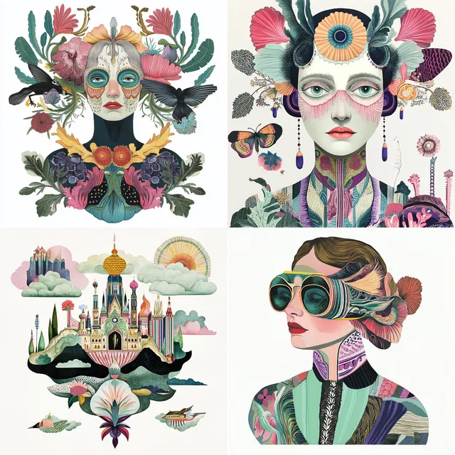 Стиль прекрасно подходит для редакционной иллюстрации, моды и брендинга, предлагая сложные композиции и витиеватые дизайны. Однако в некоторых контекстах ему может не хватать фотореализма, поскольку основное внимание уделяется более стилизованному, иллюстративному подходу.